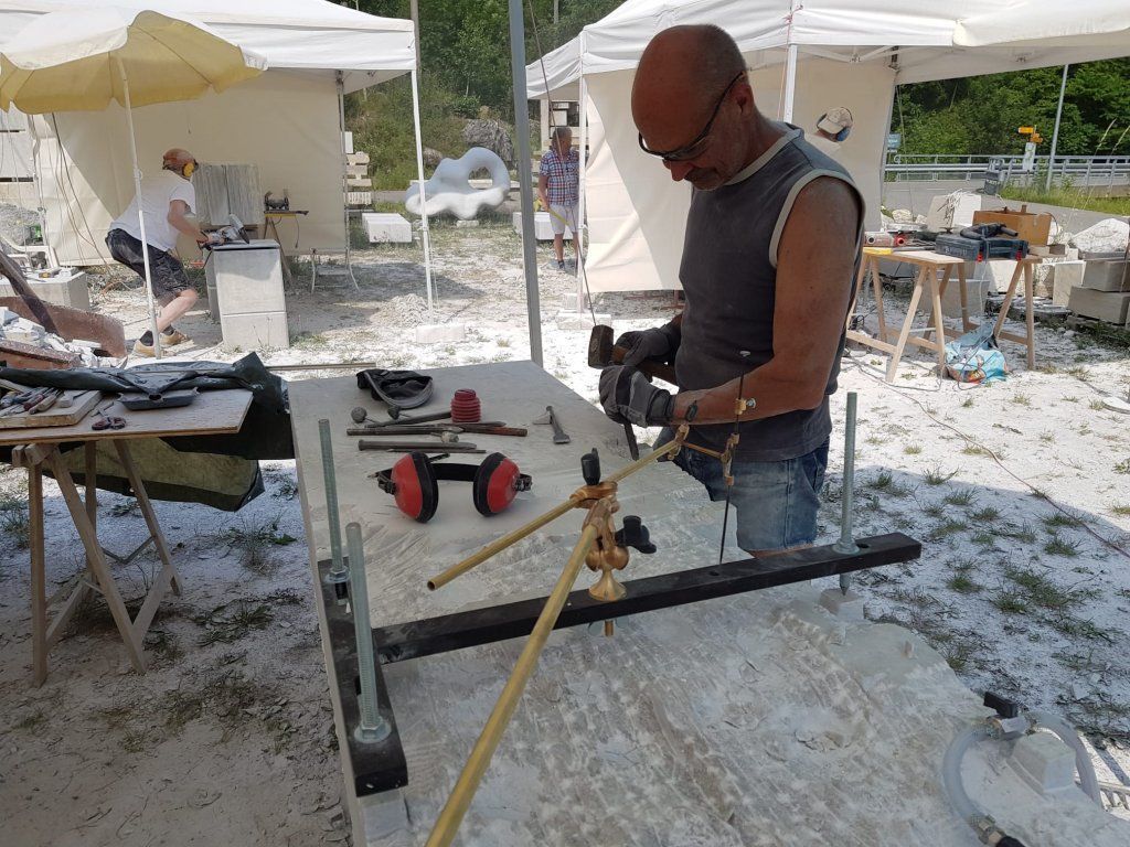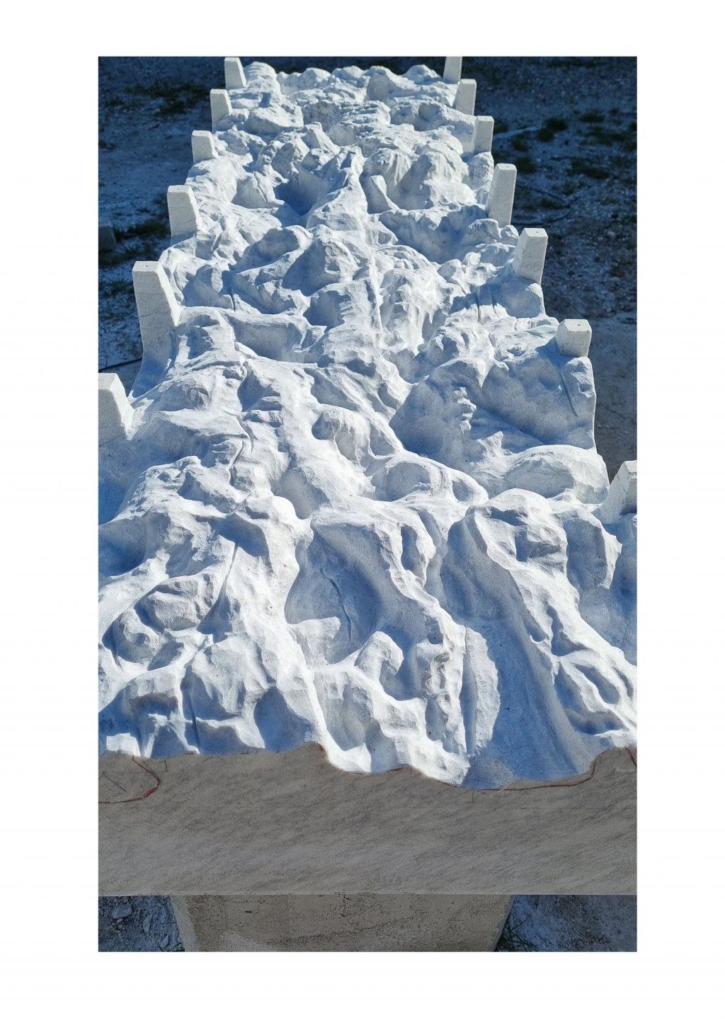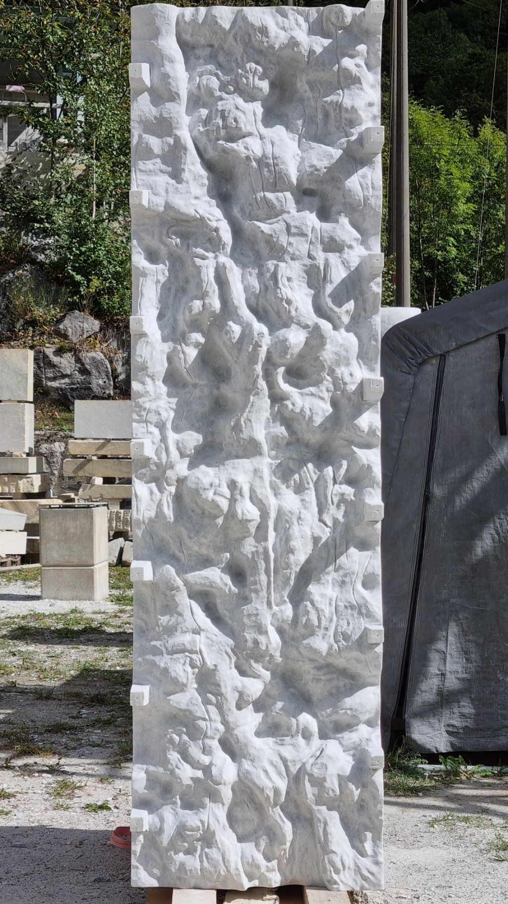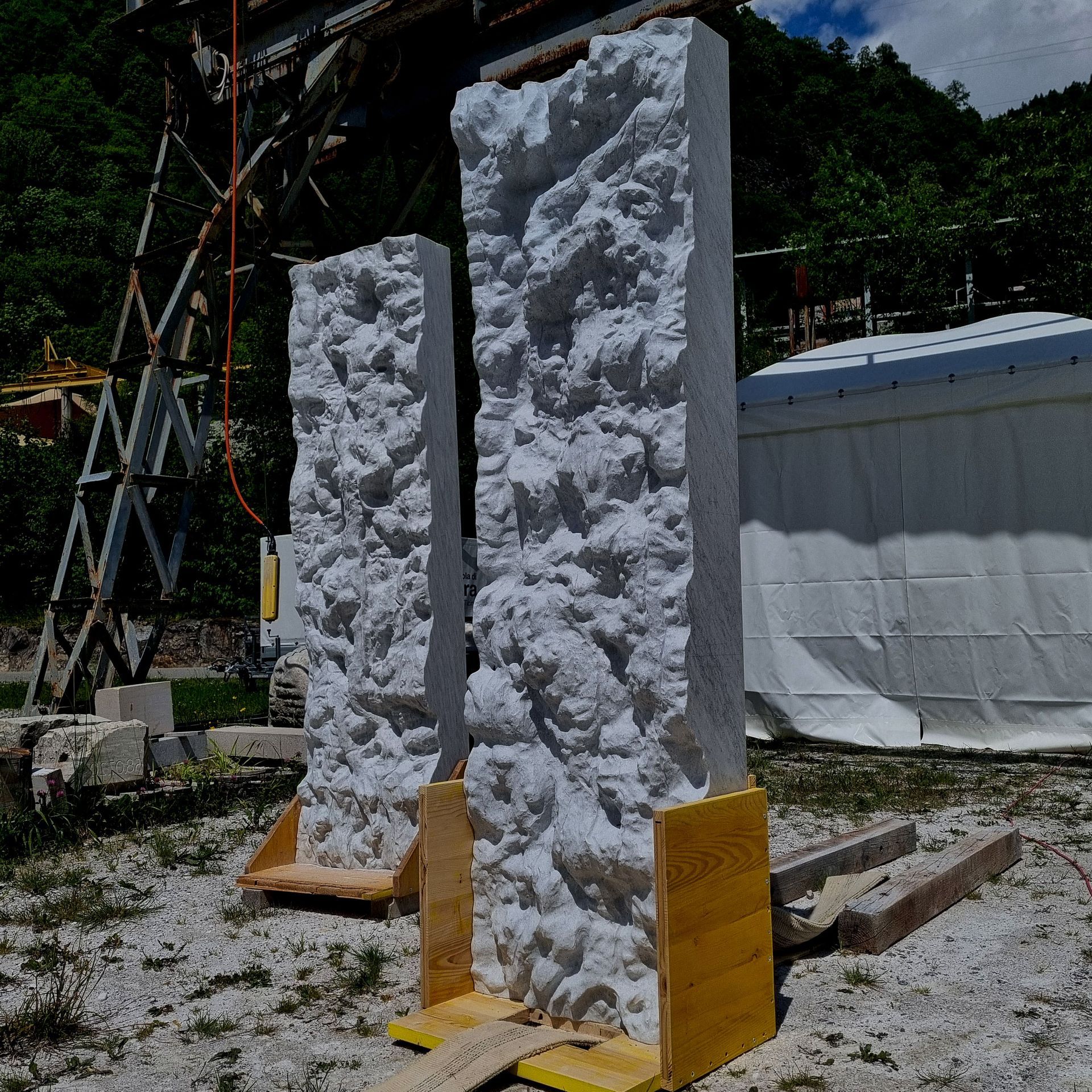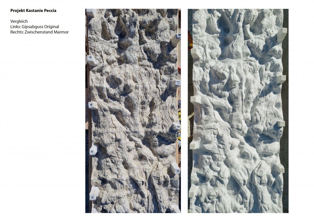 Von einer alten Kastanie aus Peccia wird die Oberfläche mit Ton abgeformt und in Gips gegossen. Das Gipsrelief wird auf Peccia-Marmor übertragen. Auf diese Art werden drei Stelen realisiert.